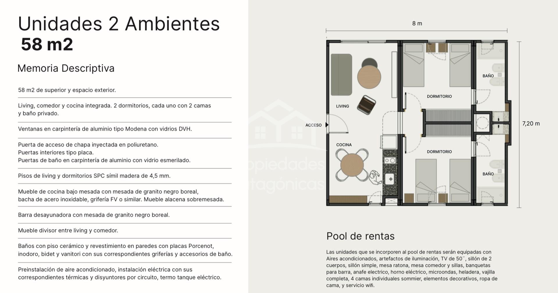 Arquitectura inteligente para invertir en VACA MUERTA. AÑELO es una de las mayores reservas de hidrocarburos no convencionales del mundo. Su crecimiento es explosivo: más de 25.000 trabajadores temporales frente a solo 8.500 habitantes estables. La demanda de alojamiento supera ampliamente a la oferta. Un modelo de renta especial para invertir con una rentabilidad estimada del 12-14% y gestión totalmente delegada. UNIDAD 3 Ambientes 58m2 Living, comedor y cocina integrada. 2 dormitorios con dos camas y baño privados. Ventanas en carpintería de aluminio tipo Modena con vidrios DVH. Puerta de acceso de chapa inyectada en poliuretano. Puertas interiores tipo placas. Puertas de baño en carpintería de aluminio con vidrio esmerilado. Pisos de living y dormitorios SPC símil madera de 4,5 mm.